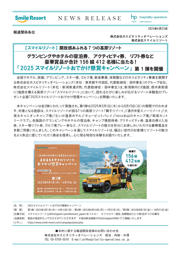 全国でホテル、旅館、グランピング、スキー場、ゴルフ場、飲食事業、保育園などのホスピタリティ事業を展開する株式会社ホスピタリティオペレーションズ(本社:東京都千代田区、代表取締役:田中章生)のグループ会社、株式会社スマイルリゾート(本社:新潟県湯沢町、代表取締役:田中章生)は、新潟県内に6施設、栃木県那須に1施設を構える高原リゾート「スマイルリゾート」において、訪れるたびに楽しみが広がるリゾート体験型のプレゼント企画「2025スマイルリゾートおでかけ懸賞キャンペーン」を開催いたします。
