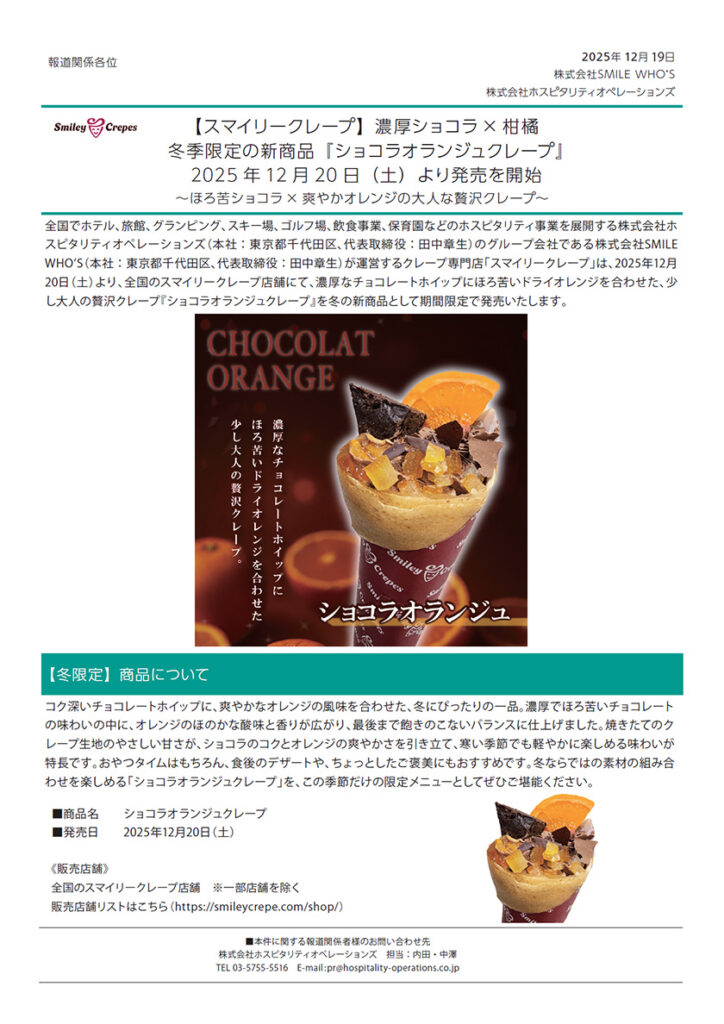 全国でホテル、旅館、グランピング、スキー場、ゴルフ場、飲食事業、保育園などのホスピタリティ事業を展開する株式会社ホスピタリティオペレーションズ(本社:東京都千代田区、代表取締役:田中章生)のグループ会社である株式会社SMILE WHO’S(本社:東京都千代田区、代表取締役:田中章生)が運営するクレープ専門店「スマイリークレープ」は、2025年12月20日(土)より、全国のスマイリークレープ店舗にて、濃厚なチョコレートホイップにほろ苦いドライオレンジを合わせた、少し大人の贅沢クレープ『ショコラオランジュクレープ』を冬の新商品として期間限定で発売いたします。