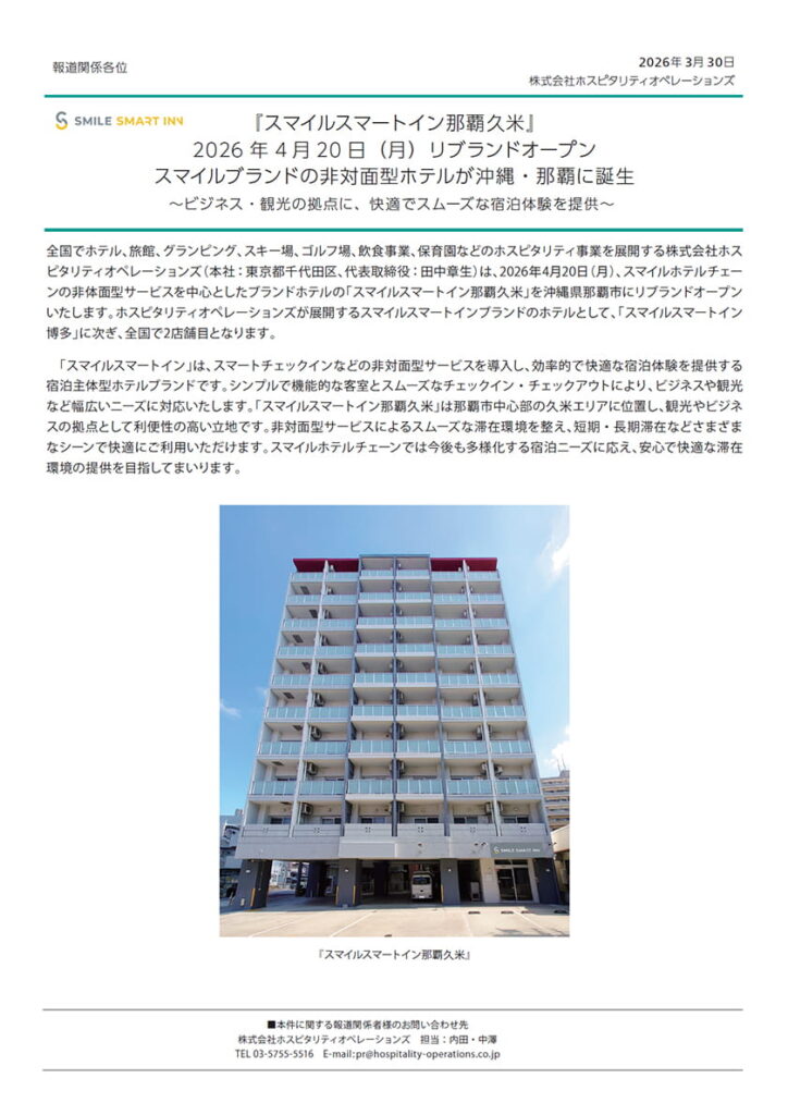 2026年4月20日(月)、スマイルホテルチェーンの非体面型サービスを中心としたブランドホテルの「スマイルスマートイン那覇久米」を沖縄県那覇市にリブランドオープンいたします。ホスピタリティオペレーションズが展開するスマイルスマートインブランドのホテルとして、「スマイルスマートイン博多」に次ぎ、全国で2店舗目となります。