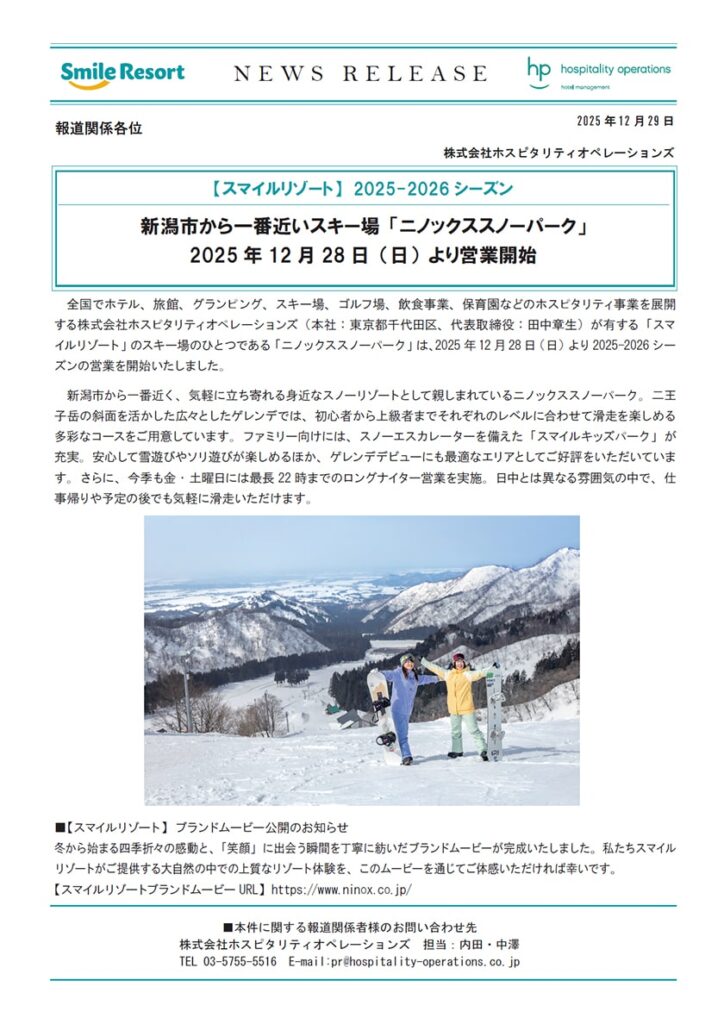 全国でホテル、旅館、グランピング、スキー場、ゴルフ場、飲食事業、保育園などのホスピタリティ事業を展開する株式会社ホスピタリティオペレーションズ(本社:東京都千代田区、代表取締役:田中章生)が有する「スマイルリゾート」のスキー場のひとつである「ニノックススノーパーク」は、2025年12月28日(日)より2025-2026シーズンの営業を開始いたしました。