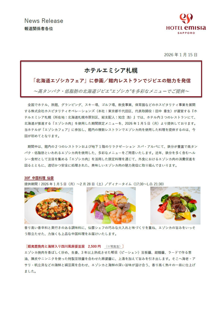 『ホテルエミシア札幌(所在地:北海道札幌市厚別区、総支配人:知念 浩)』では、ホテル内3つのレストランにて、北海道が推進する「エゾシカ肉」を使用した期間限定メニューを、2026年1月5日(月)より提供しております。当ホテルが「エゾシカフェア」に参加し、館内の複数レストランでエゾシカ肉を使用した料理を提供するのは、今回が初めてとなります。近年、鉄分を多く含むヘルシー食材として注目を集める「エゾシカ肉」を活用した限定料理を通じて、外食におけるエゾシカ肉の消費促進を図るとともに、適切かつ安全に処理された、美味しいエゾシカ肉の魅力発信に取り組んでまいります。
