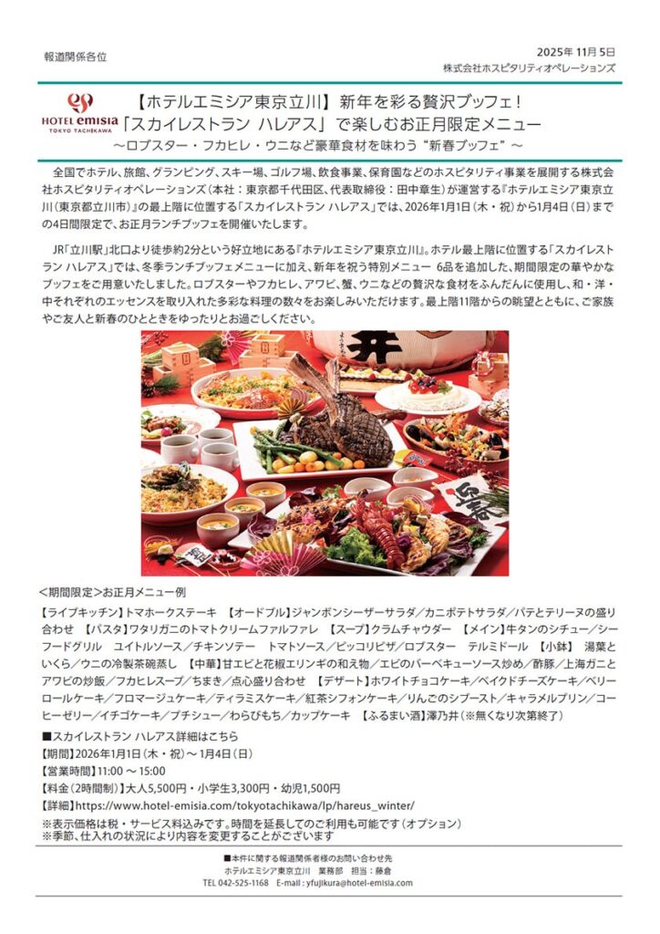 『ホテルエミシア東京立川』(東京都立川市)の最上階に位置する「スカイレストラン ハレアス」では、2026年1月1日(木・祝)から1月4日(日)までの4日間限定で、お正月ランチブッフェを開催いたします。冬季ランチブッフェメニューに加え、新年を祝う特別メニュー6品を追加した、期間限定の華やかなブッフェをご用意いたしました。ロブスターやフカヒレ、アワビ、蟹、ウニなどの贅沢な食材をふんだんに使用し、和・洋・中それぞれのエッセンスを取り入れた多彩な料理の数々をお楽しみいただけます。最上階11階からの眺望とともに、ご家族やご友人と新春のひとときをゆったりとお過ごしください。