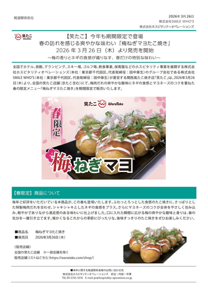 全国でホテル、旅館、グランピング、スキー場、ゴルフ場、飲食事業、保育園などのホスピタリティ事業を展開する株式会社ホスピタリティオペレーションズ(本社:東京都千代田区、代表取締役:田中章生)のグループ会社である株式会社SMILE WHO’S(本社:東京都千代田区、代表取締役:田中章生)が運営する関西風たこ焼き店「笑たこ」は、2026年3月26日(木)より、全国の笑たこ店舗(京たこ含む)にて、梅肉だれの爽やかな酸味にネギの食感とマヨネーズのコクを重ねた春の限定メニュー『梅ねぎマヨたこ焼き』を期間限定で販売いたします。
