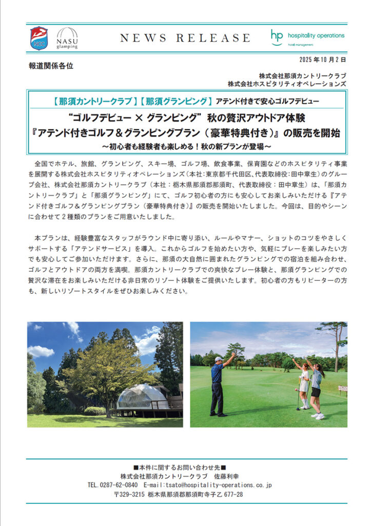 全国でホテル、旅館、グランピング、スキー場、ゴルフ場、飲食事業、保育園などのホスピタリティ事業を展開する株式会社ホスピタリティオペレーションズ(本社:東京都千代田区、代表取締役:田中章生)のグループ会社、株式会社那須カントリークラブ(本社:栃木県那須郡那須町、代表取締役:田中章生)は、「那須カントリークラブ」と「那須グランピング」にて、ゴルフ初心者の方にも安心してお楽しみいただける『アテンド付きゴルフ&グランピングプラン(豪華特典付き)』の販売を開始いたしました。今回は、目的やシーンに合わせて2種類のプランをご用意いたしました。