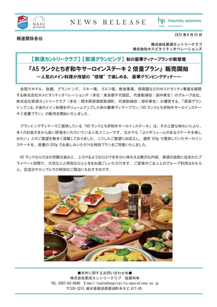 全国でホテル、旅館、グランピング、スキー場、ゴルフ場、飲食事業、保育園などのホスピタリティ事業を展開する株式会社ホスピタリティオペレーションズ(本社:東京都千代田区、代表取締役:田中章生)のグループ会社、株式会社那須カントリークラブ(本社:栃木県那須郡那須町、代表取締役:田中章生)が運営する、「那須グランピング」は、夕食のメイン料理をボリュームアップした秋の豪華ディナープラン、「A5ランクとちぎ和牛サーロインステーキ2倍量プラン」の販売を開始いたしました。